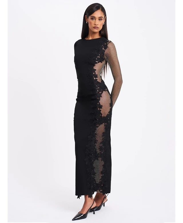Miss Circle Women's Bailey Lace Trim Crystal Net Cutout Long Sleeve Gown