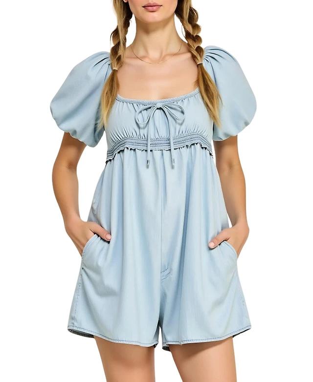 Modenaire Women's Puff-Sleeve Tie-Front Empire-Waist Romper
