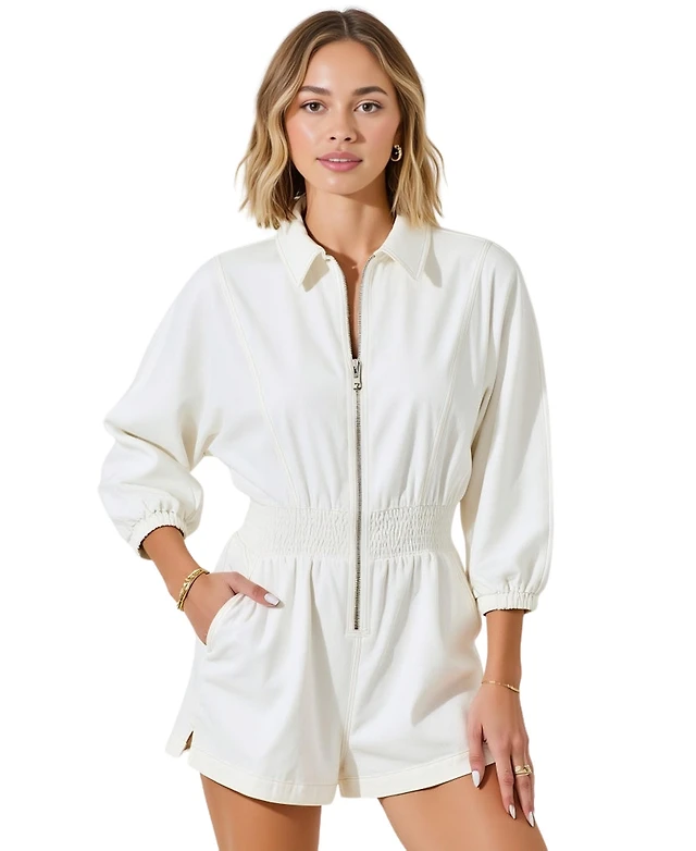 Modenaire Women's Zip Front Smocked Waist 3/4 Sleeve Romper