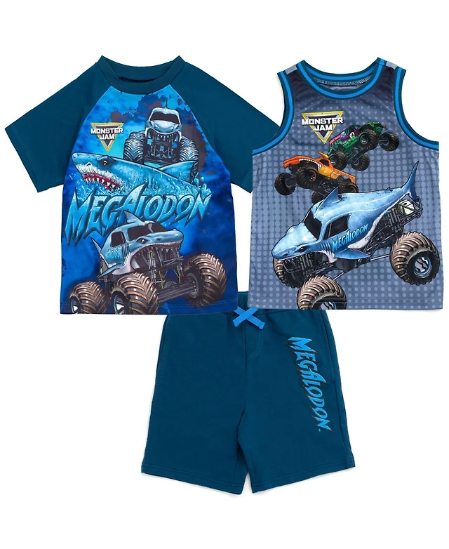 Monster Jam Boys Grave Digger El Toro Loco Megalodon T-Shirt Tank Top and French Terry Shorts 3 Piece Set to