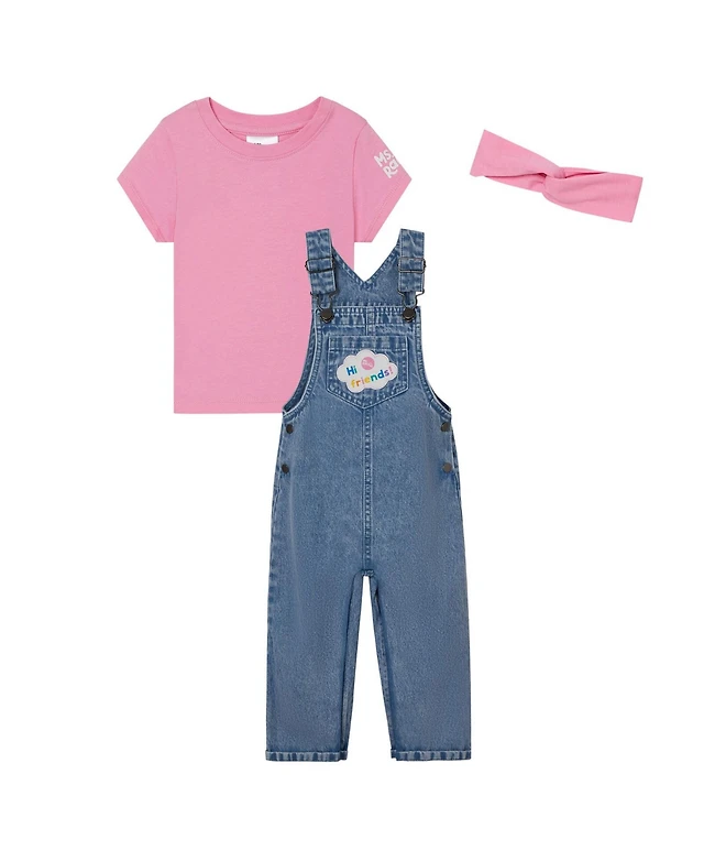 Ms. Rachel Baby Girls Denim Square Neck Vintage Wash Cosplay Overall, T-Shirt and Headband 3 Piece Outfit Set
