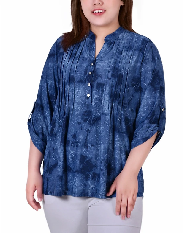 Plus 3/4 Roll Tab Sleeve Y-Neck Top