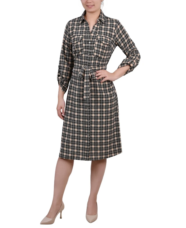 Ny Collection Petite Printed Long Sleeve Roll Tab Shirtdress