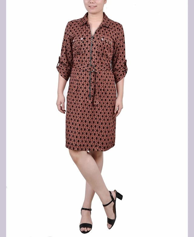 Ny Collection Petite Belted Roll Tab Zip Front Shirtdress