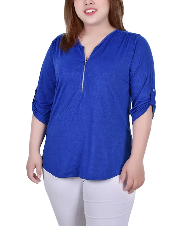 Ny Collection Plus Size 3/4 Roll Tab Zip Front Jacquard Knit Top