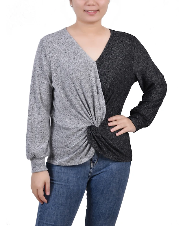 Ny Collection Petite Long Sleeve Twist Front Colorblocked Top