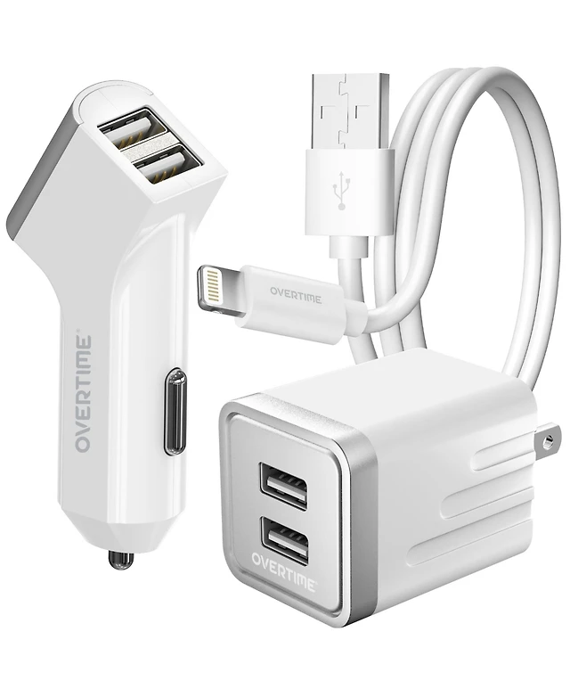 Overtime Apple MFi Certified 3PC iPhone Charging Set for Home, Office, and Car | Includes 4ft Charging Cable - White