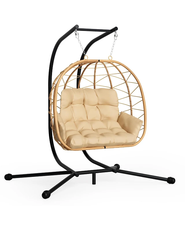 Pamapic Outdoor 2-Person Hanging Wicker Double Egg Porch Swing Chair with Stand and Beige Cushion