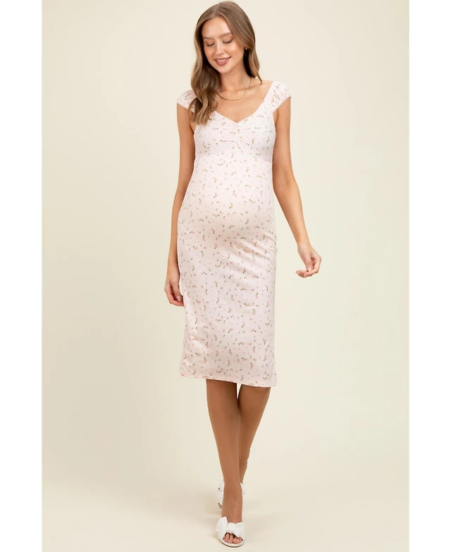 Pinkblush Cream Multi Ditsy Floral Smocked Maternity Midi Dress