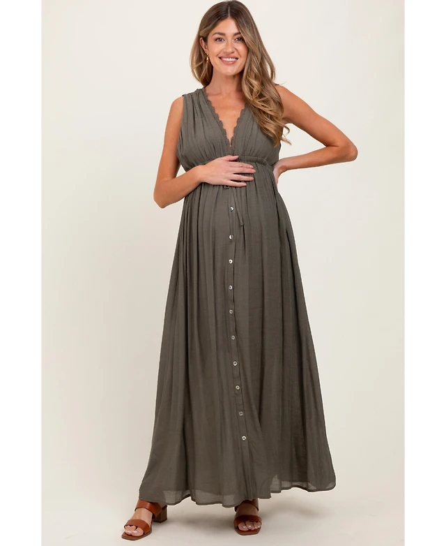 Pinkblush Olive Deep V-Neck Sleeveless Button Down Maternity Maxi Dress