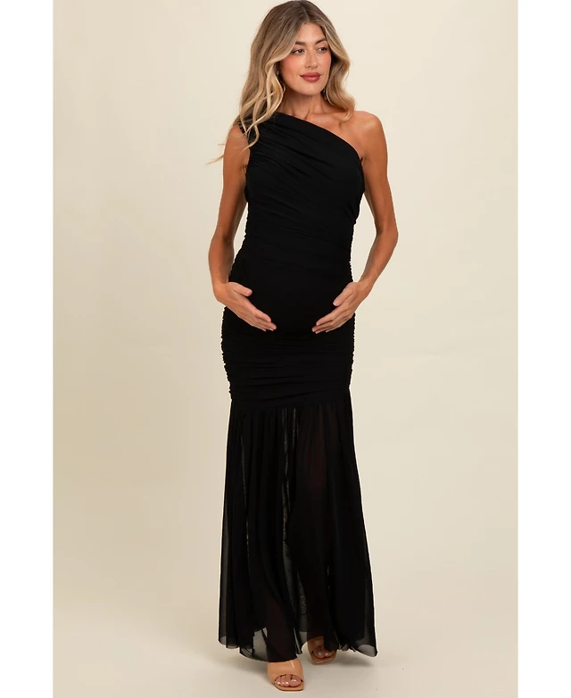 Pinkblush Light Pink Ruched Mesh One Shoulder Maternity Maxi Dress