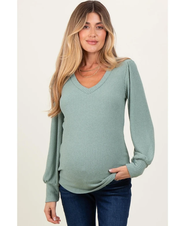 Pinkblush Maternity Light Olive Ribbed Knit V-Neck Button Cuff Top