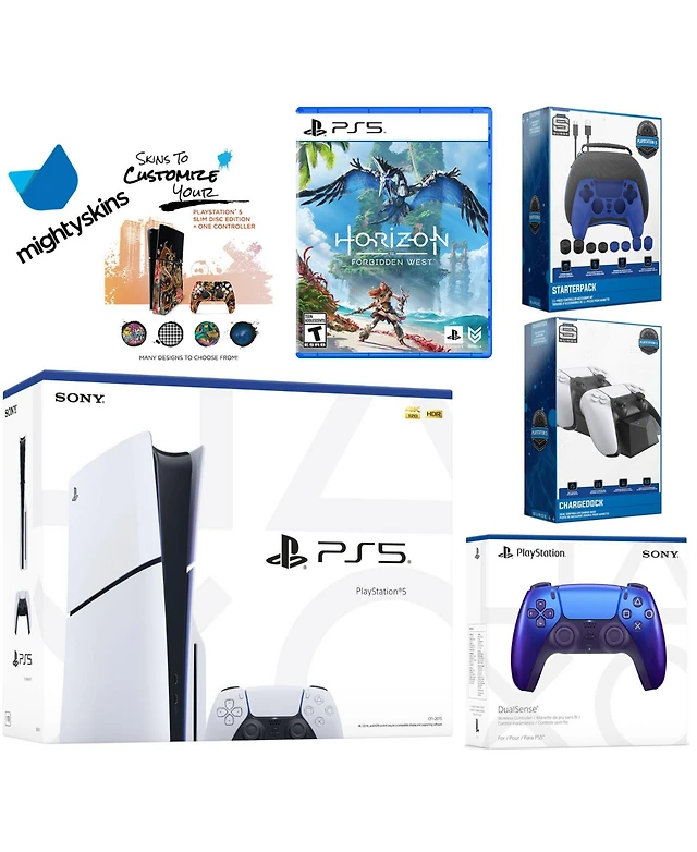 Sony Playstation 5 Slim Disc with Horizon Forbidden West, Extra Galactic Purple Controller, Gamer Kit, Charge Dock and MightySkins Decal Voucher + 2 Y