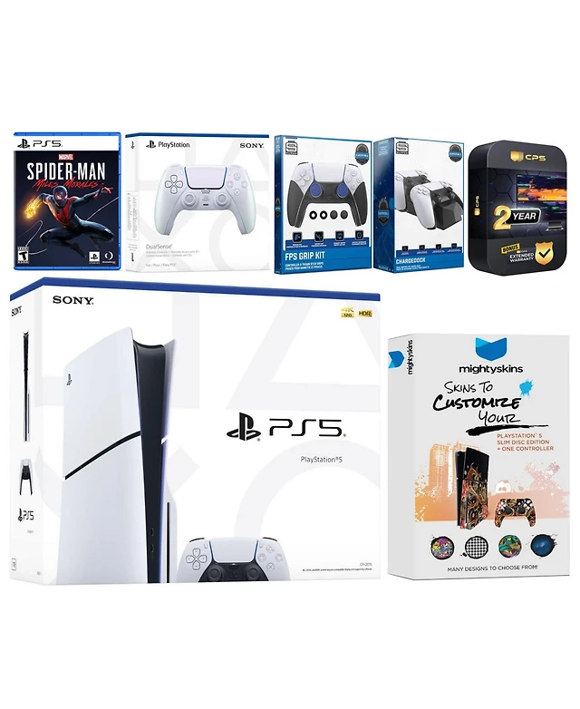 Sony Playstation 5 Slim Disc Bundle with Spider-Man: Miles Morales, Extra Controller, Trigger Stop Kit, Fps Grip Kit and MightySkins Decal Voucher