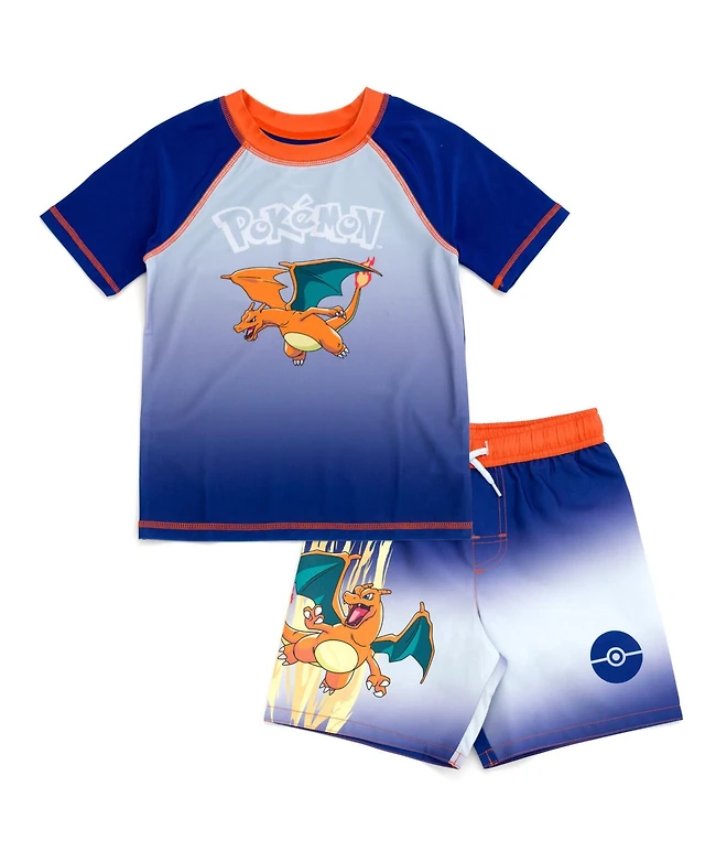 Pokemon Boys Pikachu Upf 50+ Rash Guard Swim Trunks Outfit Set to