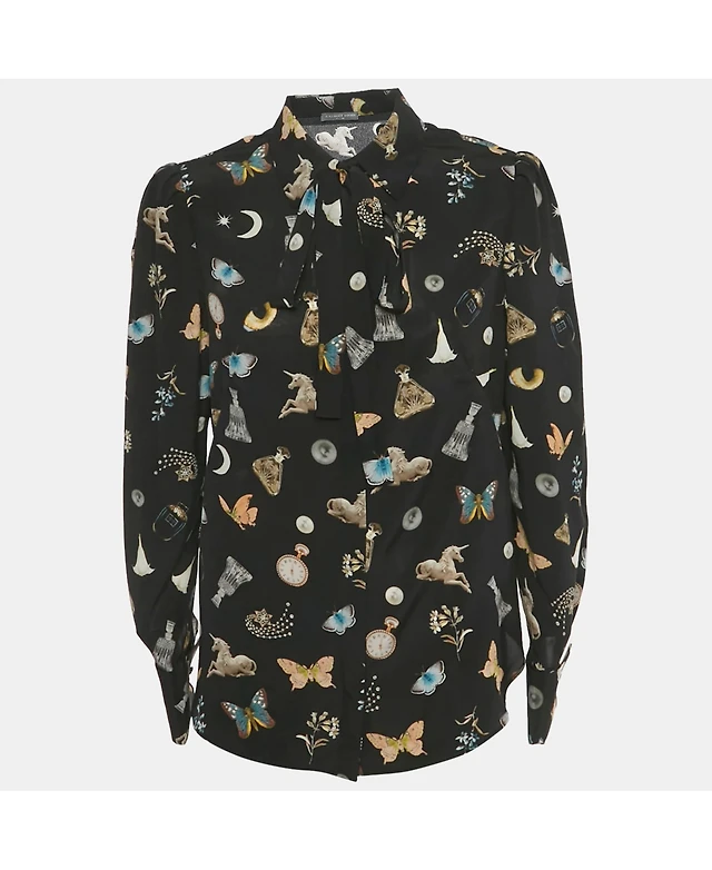 Pre-Owned Alexander Mcqueen Women's Printed Silk Tie Up Neck Blouse