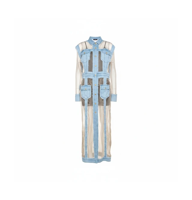 Pre-Owned Balmain Women's Bicolor Sheer Silk Panelled Denim Trim Shirt Dress