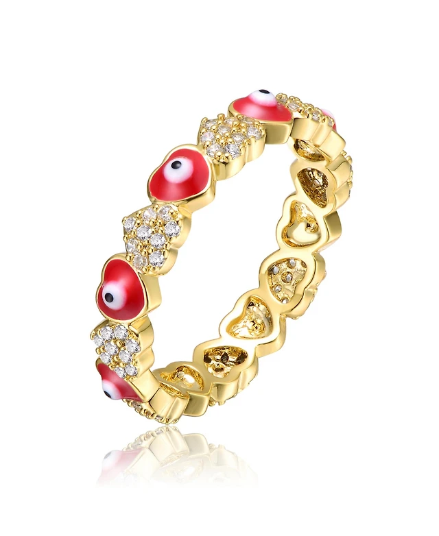 Ra Young Adults/Teens 14k Yellow Gold Plated with Cubic Zirconia Colorful Enamel Evil Eye Repeating Hearts Stacking Ring