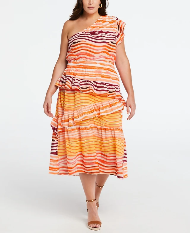 Ella Rafaella Plus Cotton One Shoulder Ruffle Midi Dress