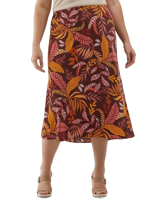 Ella Rafaella Plus Leaf Print Shine Midi Bias Skirt