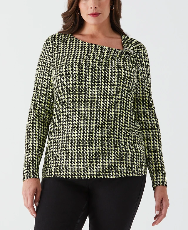 Ella Rafaella Plus Houndstooth Print Asymmetric Neck Long Sleeve Top