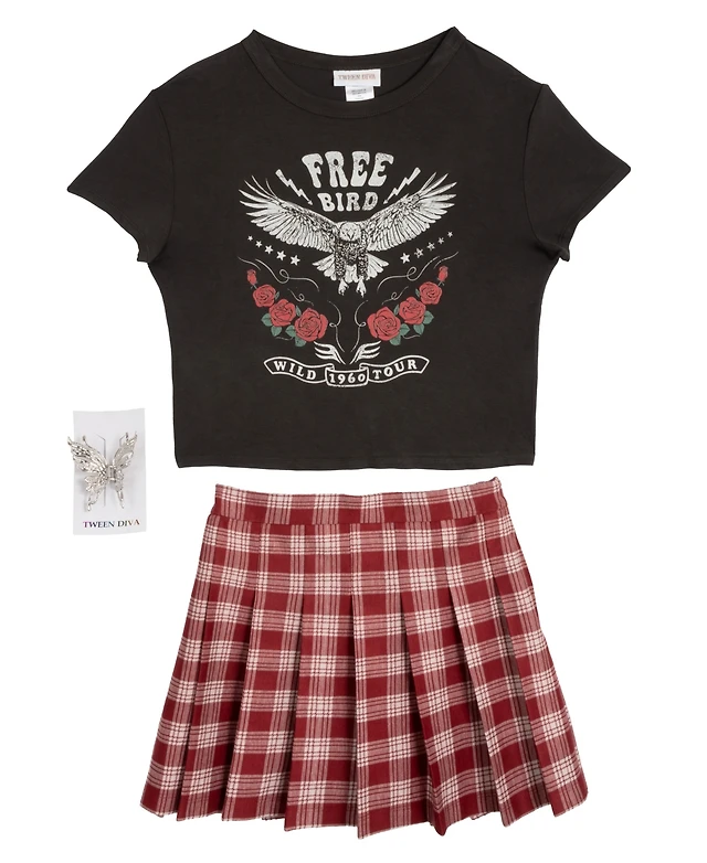 Rare Editions Big Girls 2-Piece T-Shirt and Plaid Pleated Skort Set Butterfly Hair Clip