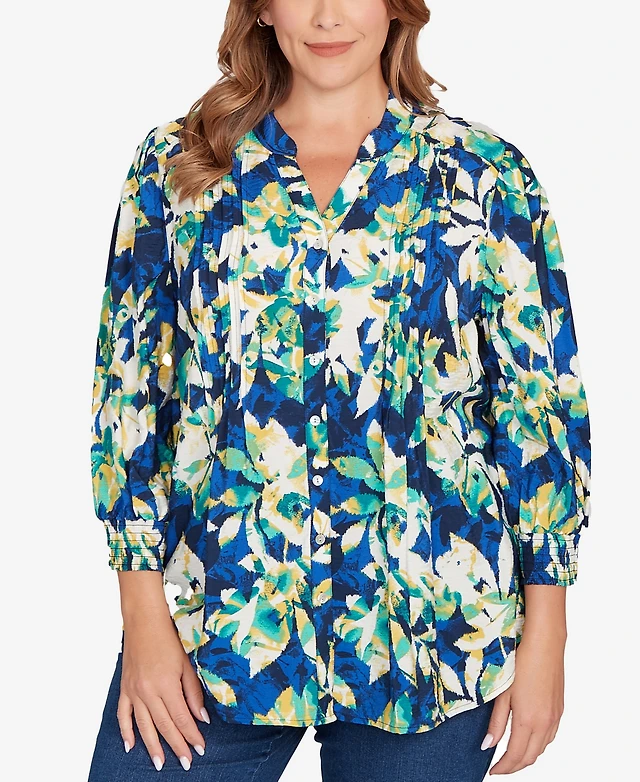 Ruby Rd. Plus Button Sleeve Bold Floral Top