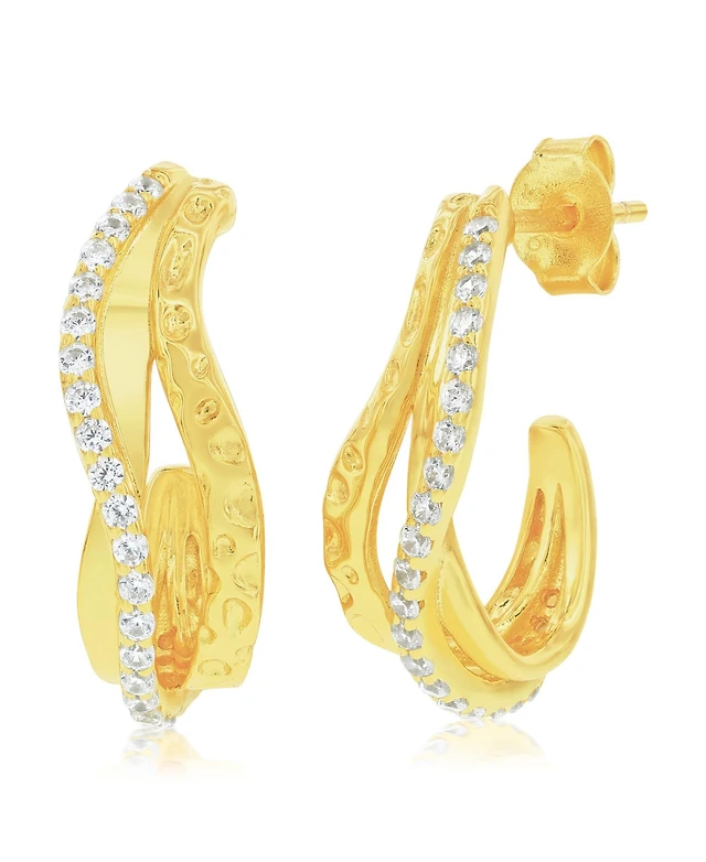 Simona Sterling Silver, Triple Row Cz & Polished Half Hoop Earrings