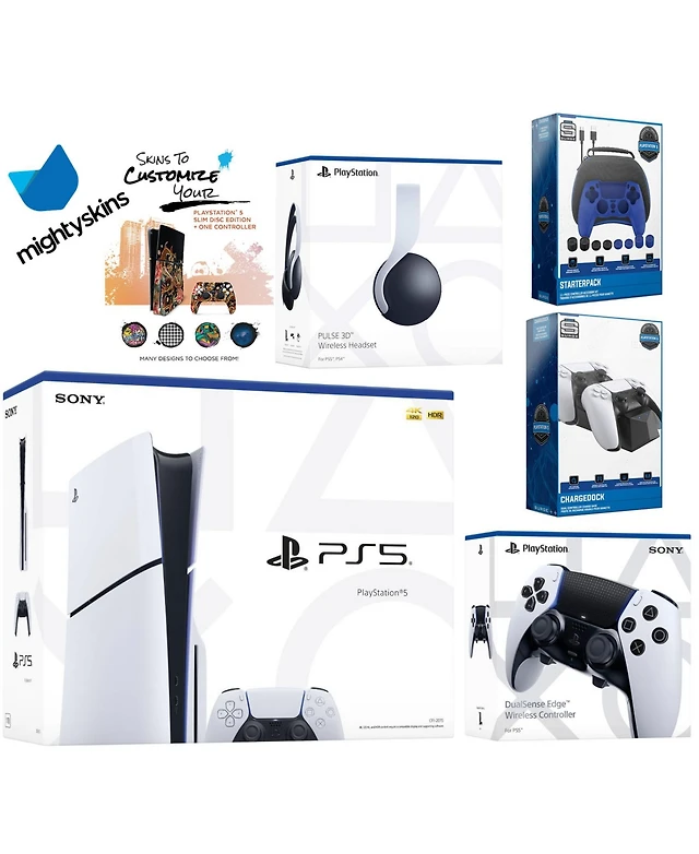 Sony Playstation 5 Slim Disc Bundle with White Pulse Headset, Extra Edge Controller, Fps Grip Kit, Dual Charge Dock and MightySkins Decal Voucher