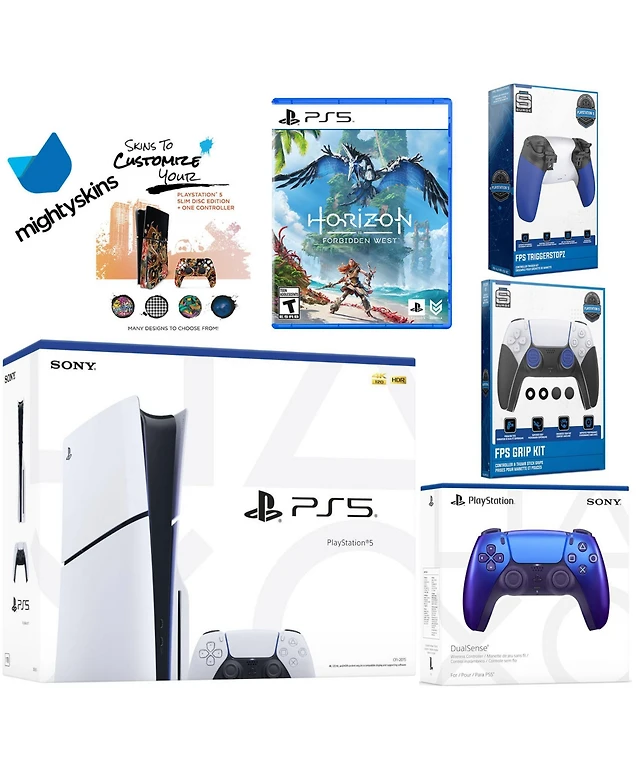 Sony Playstation 5 Slim Disc Bundle with Horizon Forbidden West, Extra Controller, Fps Grip Kit, Dual Charge Dock and MightySkins Decal Voucher