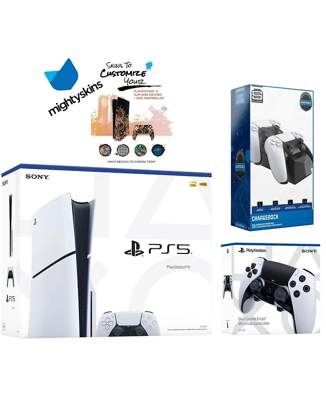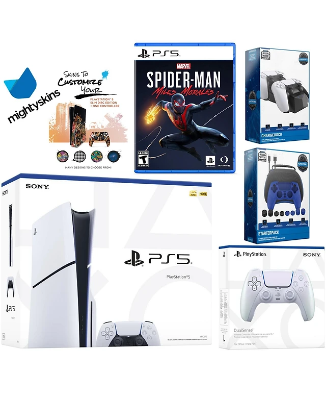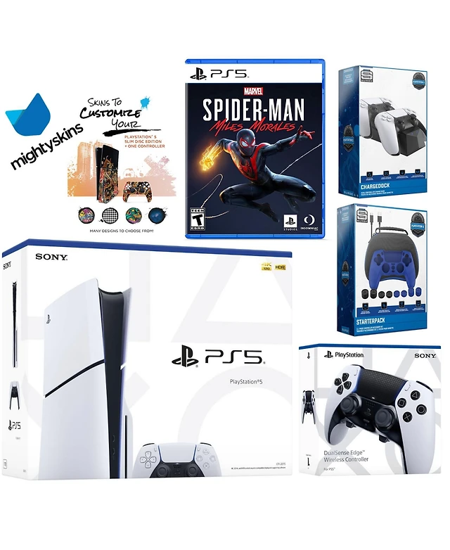 Sony Playstation 5 Slim Disc Bundle with Spider-Man: Miles Morales, Extra Edge Controller, Fps Grip Kit, Dual Charge Dock and MightySkins Decal Vouche