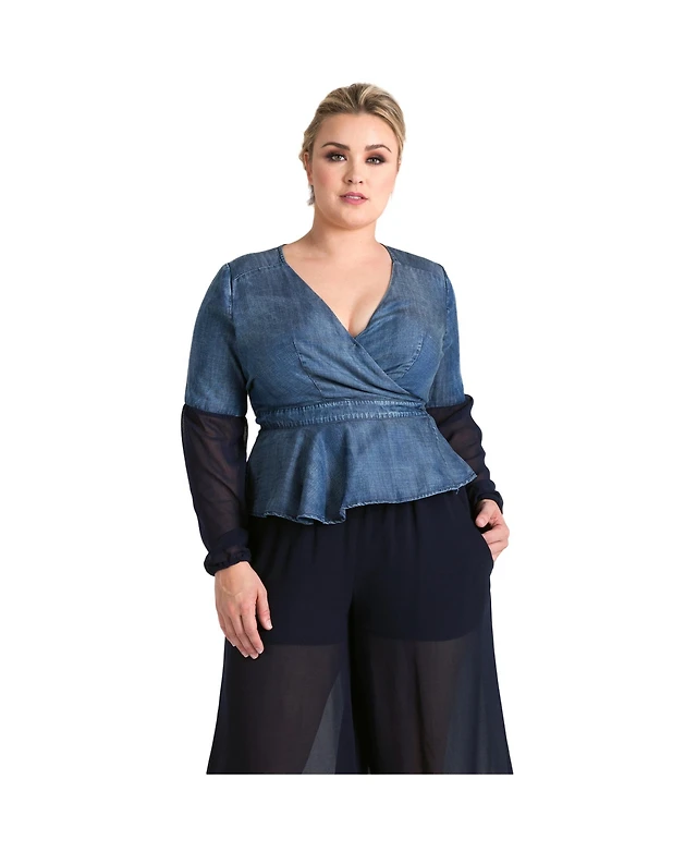 Standards & Practices Plus Size Dip Dye Bell Sleeve Denim Wrap Crop Top