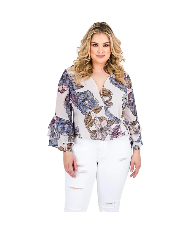 Plus Size Women's Floral Print Chiffon Flare Sleeve Blouse