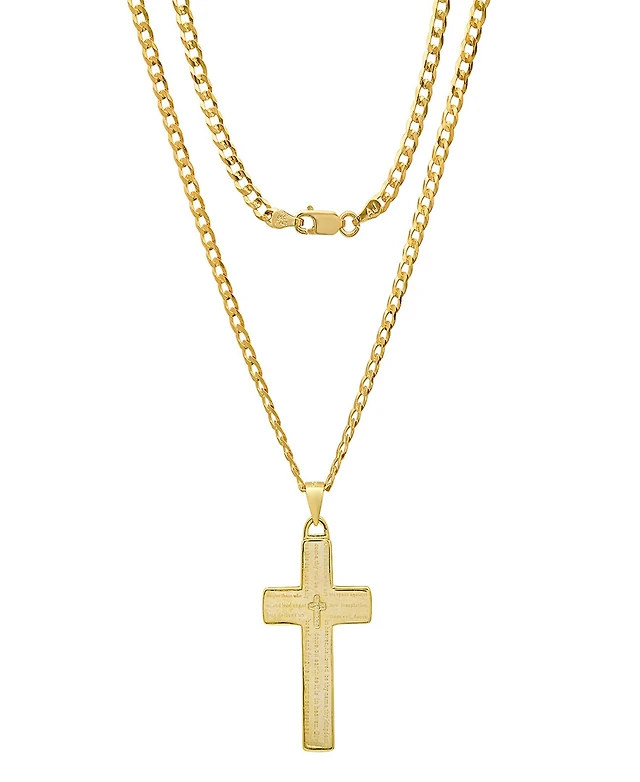 Steeltime Unisex 14K Gold Plated Sterling Silver Cuban Super Flat Chain and Lord's Prayer Cross Pendant Bracelet