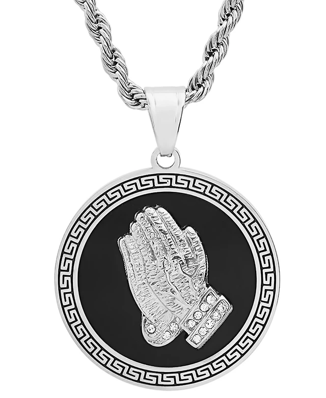 Steeltime Men's Stainless Steel Prayer Hand & Greek Key 24" Pendant Necklace