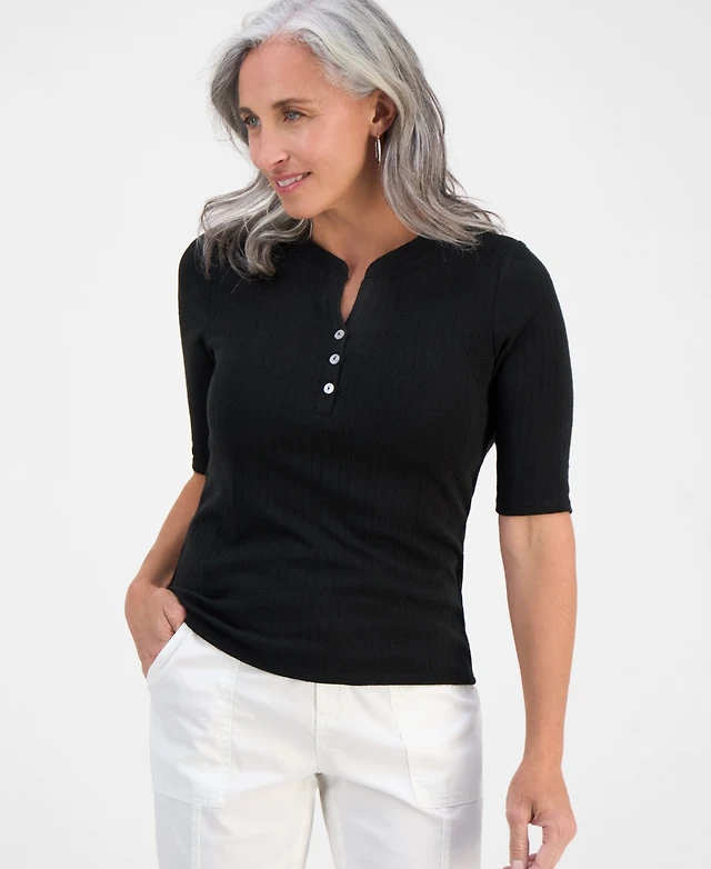 Style & Co Petite Pointelle Elbow-Sleeve Henley Knit Top, Exclusively at Macy's