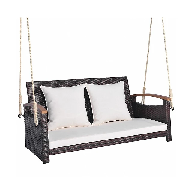 Sugift Single Rattan Porch Swing with Armrests Cushion and Hanging Ropes