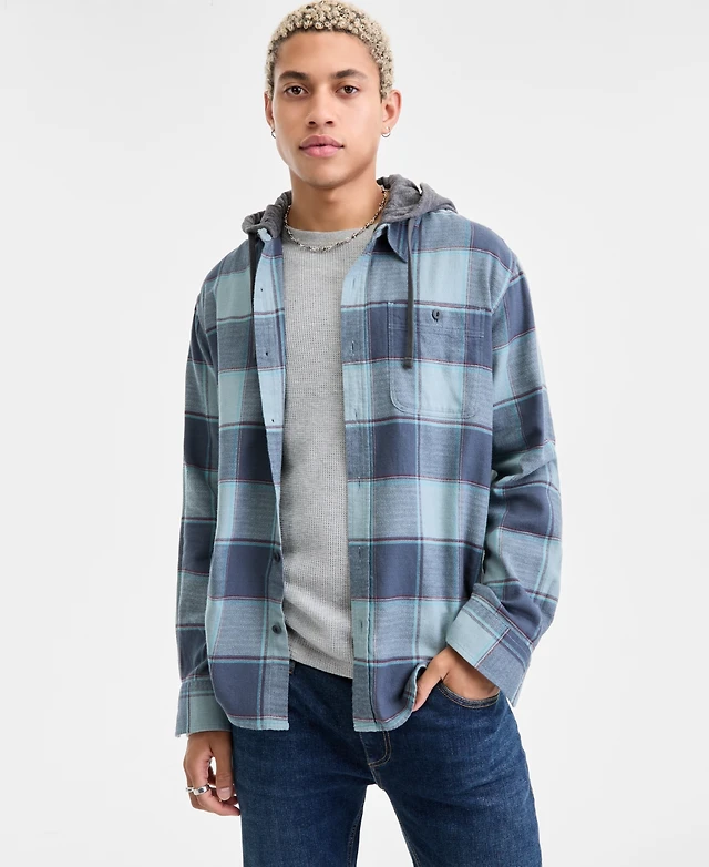 Sun + Stone Men's Irving Layered-Look Hooded Cotton Flannel Plaid Shirt, Macy's Exclusive