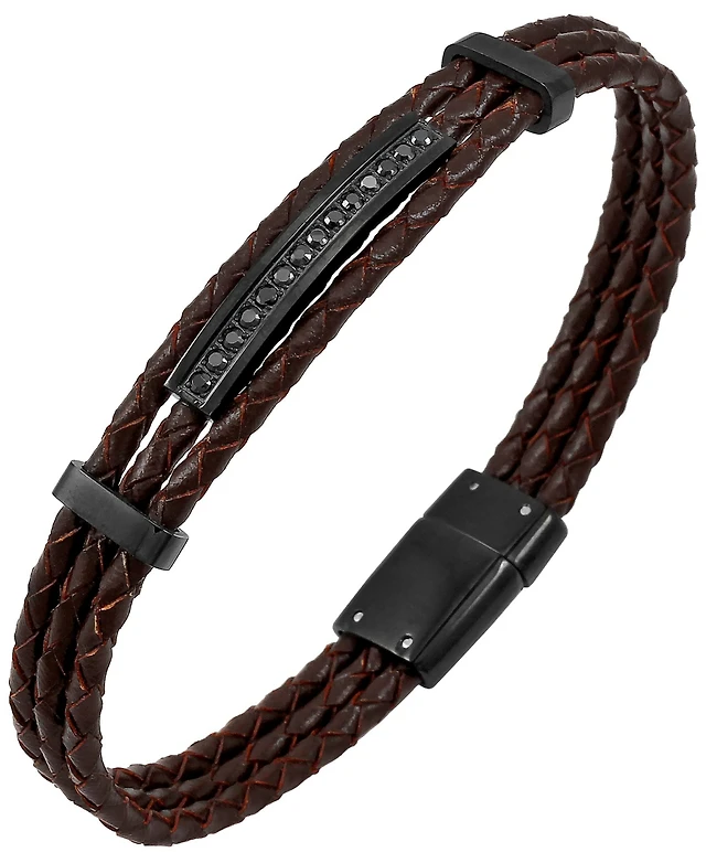 Sutton Stainless Steel And Braided Leather Bracelet With Cubic Zirconia Stations