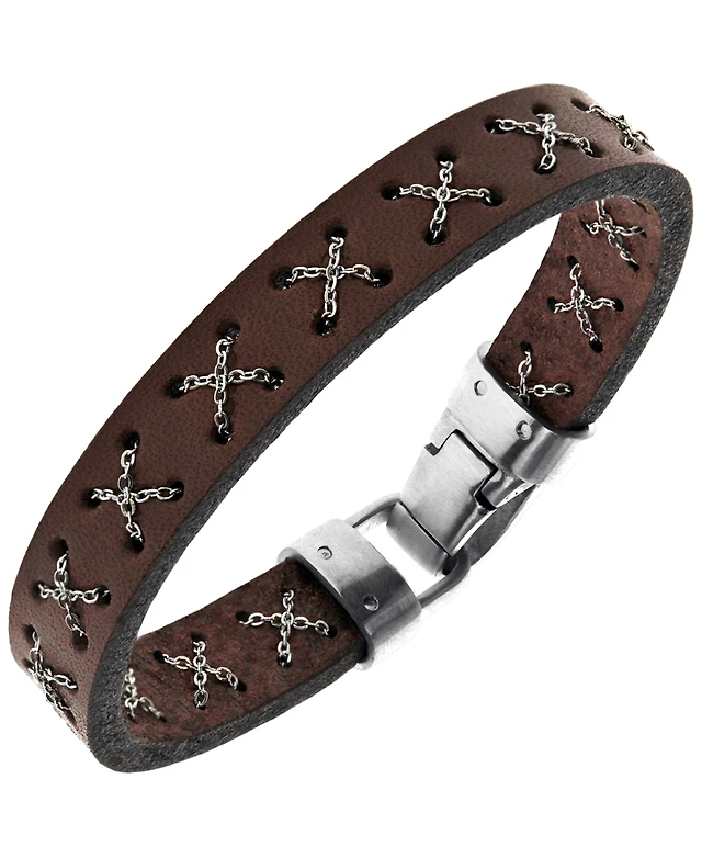 Sutton Stainless Steel Crossed Chain Brown Leather Bracelet