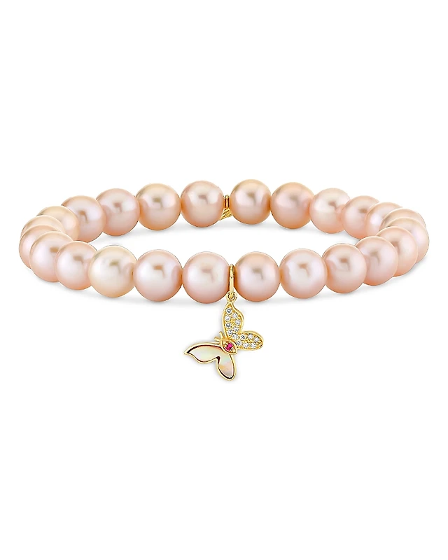 Sydney Evan 14K Yellow Gold Wicked Glinda Pink Sapphire Marquise Eye Butterfly Charm Beaded Bracelet