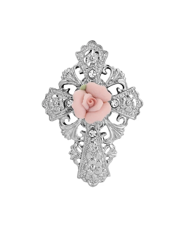Silver-Tone Pink Porcelain Rose Cross Pin