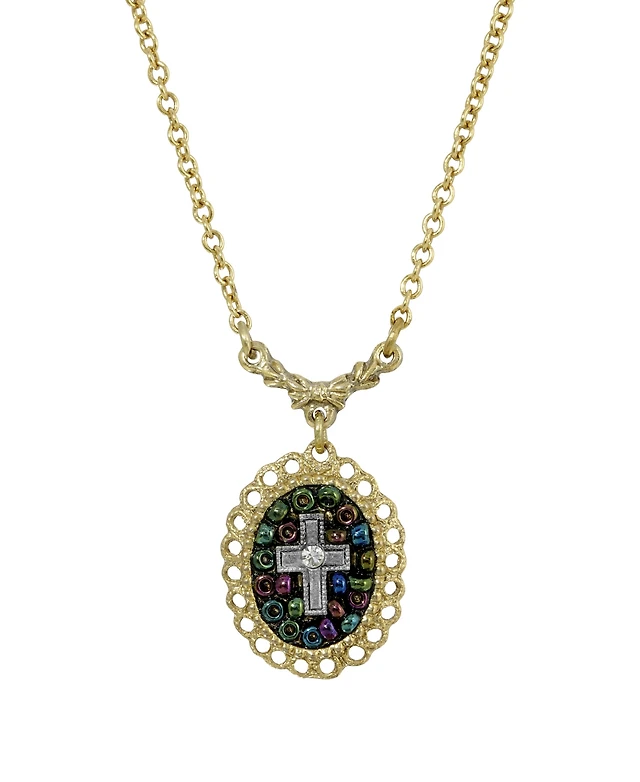 14K Gold Dipped Carded Oval Multi Color Beaded Crystal Cross Necklace