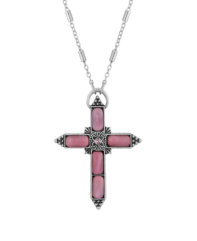 Symbols of Faith Silver-Tone Pink Moonstone Pink Crystal Cross 20" Necklace