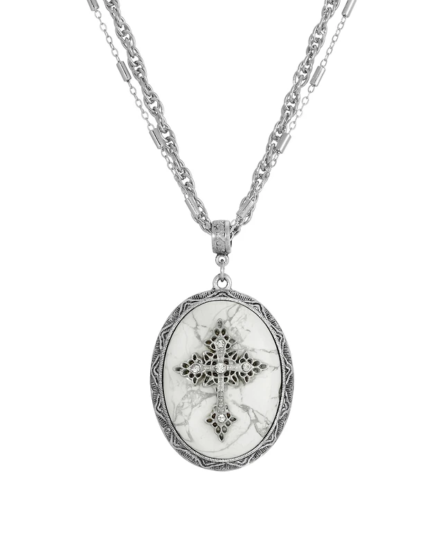 Symbols of Faith Pewter Cross White Howlite Oval Necklace