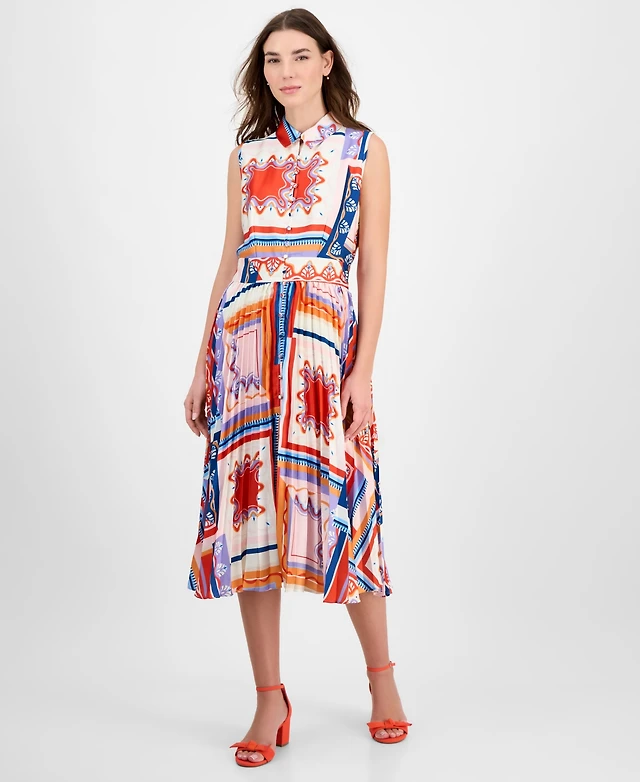 T Tahari Women's Printed Pleated Midi Shirtdress