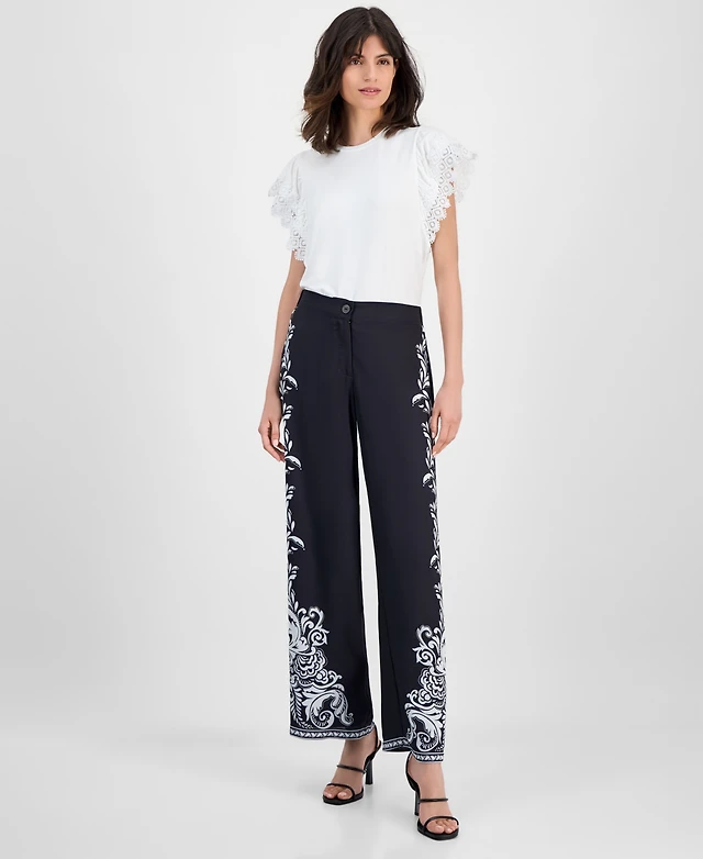 T Tahari Women's Wide-Leg Leaf-Print Straight-Leg Pants