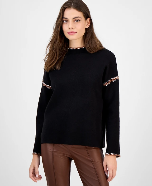 T Tahari Women's Mock-Neck Embroidered-Stitch Sweater