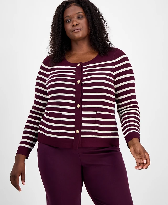 Tahari Asl Plus Scoop-Neck Striped Cardigan