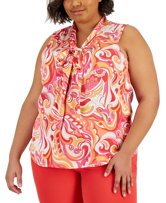 Tahari Asl Plus Size Printed Sleeveless Bow Blouse